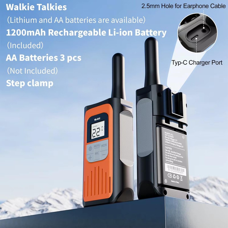 1.Rechargeable adult two-way walkie-talkie, 1200mAh lithium-ion battery and USB charging cable, support 3 AA batteries for alternate use.