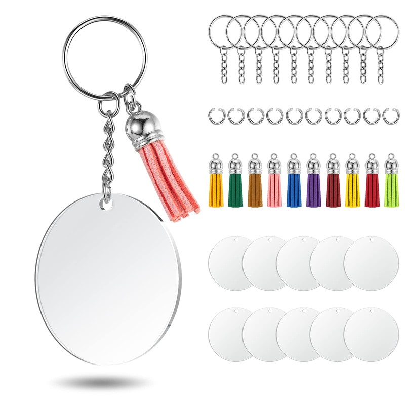 - 【Acrylic Keychain Blank Kits】--- YHYZ acrylic keychain blank bulks comes with 10pcs Clear Round Acrylic Blanks (2 inch) + 10pcs key ring with chain + 10pcs Jumper Rings + 10pcs Colorful Keychain Tassels. Suitable for vinly projects, craft DIY, personalized gift, and keychain resin ornaments making.