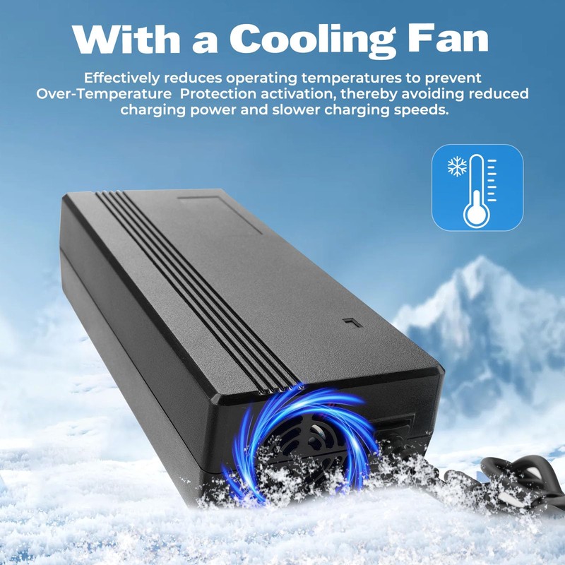 - With a Cooling Fan: This charger has a powerful cooling fan. It effectively reduces operating temperatures to prevent Over-Temperature Protection activation, thereby avoiding reduced charging power and slower charging speeds.