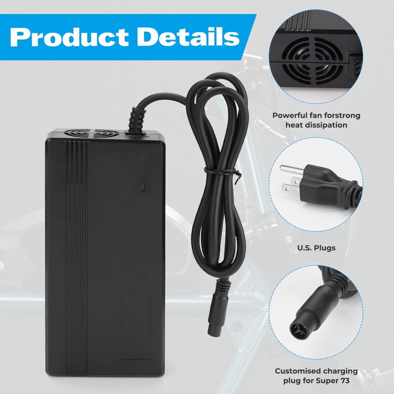 - Fitment: The battery charger is for Super 73 Z-Series/S-Series/R-Series with a three-pin connector. NOT FOR Z1/S1, PLEASE CONFIRM THE MODEL BEFORE PURCHASING. Charger Data INPUT 120~ 60hz 2.0A OUTPUT 54.6V2.8A With UL certification.