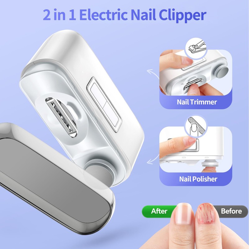 - 【2 in1 Electric Automatic Nail Clipper & Easy to Use】This nail trimmer is ONE BUTTON OPERATION. Only need to press the button, the electric nail clipper will finish cut nails, trim nails, grind / file / polish nails, and vaccum the nail debris at the same time. Compared with tradtional nail clippers, this electric nail clipper or nail file or nail trimmer, whatever you call it, makes trimming nails so easy, neat, smooth.