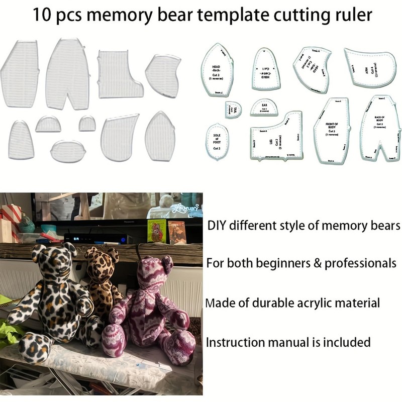 YICBOR Memory Bear Sewing Templates Set, 10Pcs Durable Acrylic Teddy Bear Sewing Patterns & Templates with Detailed Instructions for Sewing (Small)