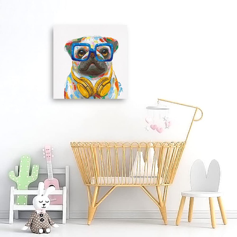 • DOG PICTURES WALL DECOR : The honest and clumsy mynah wears big square-frame glasses and earphones around his neck. He is fashionable, lively and cute. Dogs are man's most loyal companions, this is an impressive picture, whether your child or your own room, perfect for dog lovers!