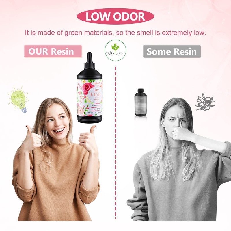 - 【LARGE VOLUME PREMIUM UV EPOXY RESIN】 You will get the uv epoxy resin with the following characteristics: crystal clear, supert hard, fast curing, low odor, less bubble, essistant to yellowing and no mixing. Wha's more, it has fantastic color stability to preserve the rich colors of your artwork.