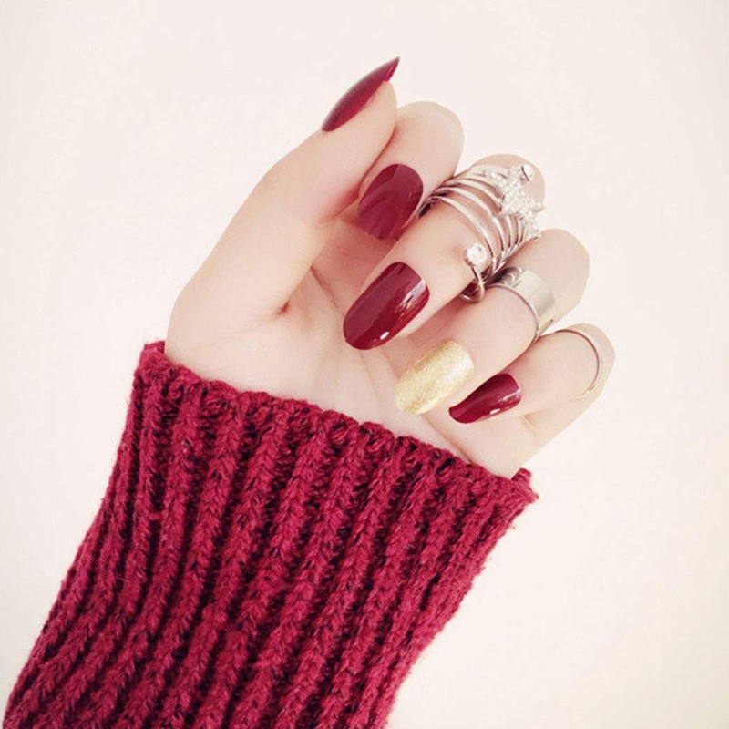Yienate False Nails Red Round Head Gold Dust French Nails Fake Nails for Women and Girls 24Pcs (Red)