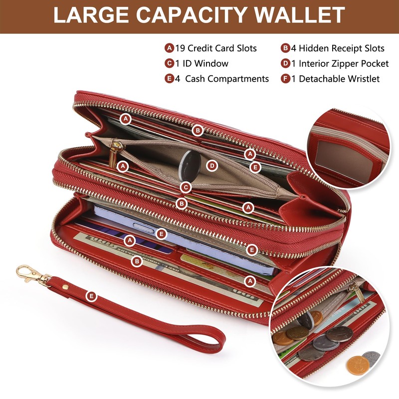 - Large Capacity Womens Wrislet Wallet: The clutch wallet consists of two large zip compartments. Roomy card holder wallet which has 19 credit card slots, 4 hidden receipt slots, 4 spaces for cash, 1 ID window and 1 zipper coin pocket. Both sides can be used to store cell phones, passports, photoes, checkbooks, stamp cards and other objects.