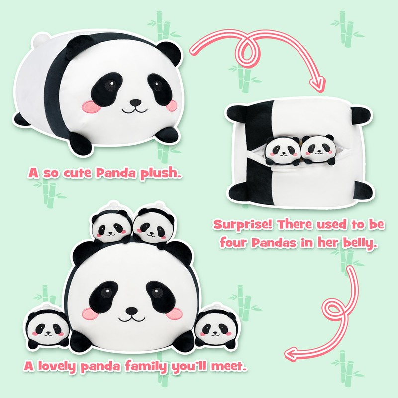 - Adorable Panda Family Set: With its playful panda design, this plush toy is sure to steal hearts at first sight. Unzip the panda’s belly to reveal an exciting surprise — four soft baby pandas hidden inside! A fun and heartwarming concept that makes it the perfect gift for panda lovers and ideal as a plush decor item.