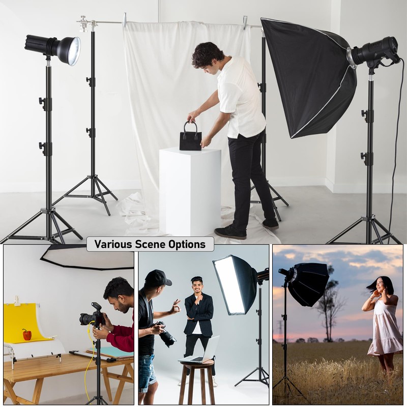 - 【Safe lighting tripod】Our flood light tripod feature a secure locking system and spring cushioning to protect your camera equipment. The spring cushioning offers resistance for height adjustments, preventing sudden drops. The easy-to-use lock secures the stand at the desired height without wobbling.