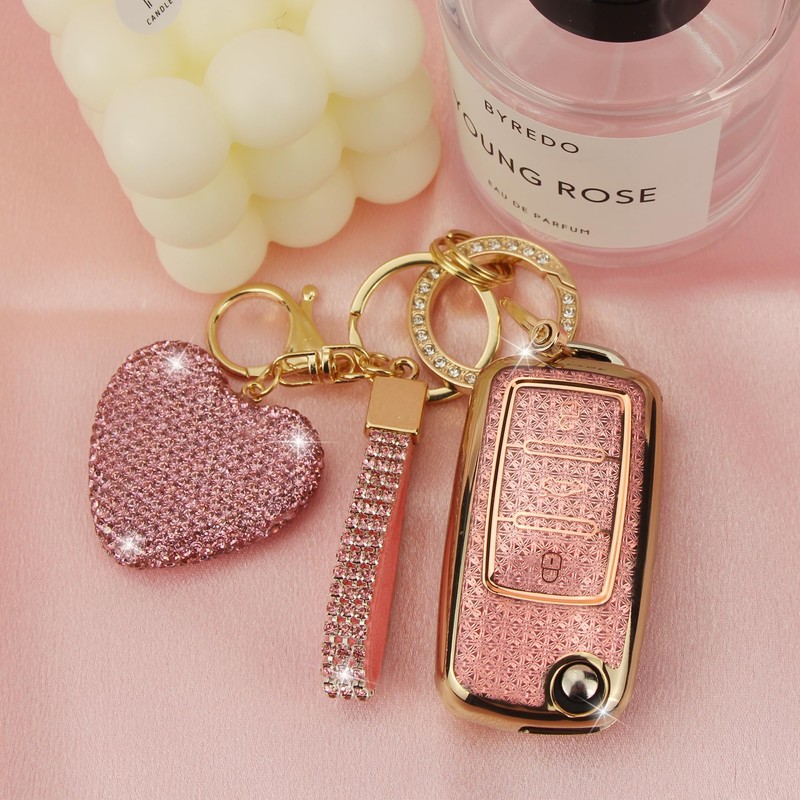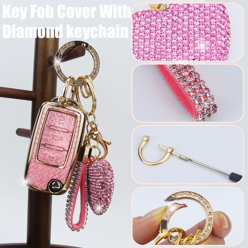 YIKECASE Key Fob Cover with Diamond Keychain Fit for Volkswagen for Women 3 Buttons (Pink-Heart)