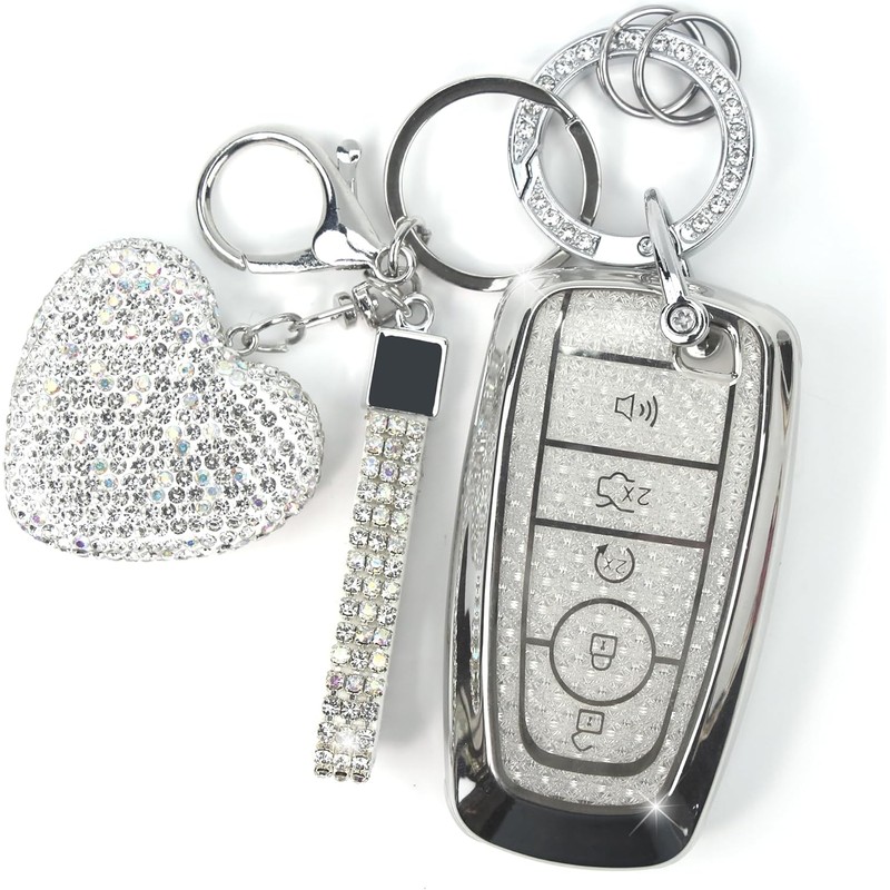 YIKECASE Key Fob Cover with Diamond Keychain for Women, Car Key Holder Compatible with Ford Explorer Fusion Edge Expedition F150 F250 F350 F450 F550 Maverick Mustang, 5 Buttons (Silver-Heart)