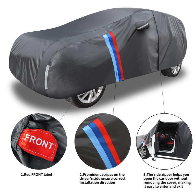 - 【Easy Installation】 Follow the easy installation guide, aligning the front label with your vehicle's front. The cover comes with a reflective mirror cover, so please pay attention to the size of the car cover and match it with the vehicle model