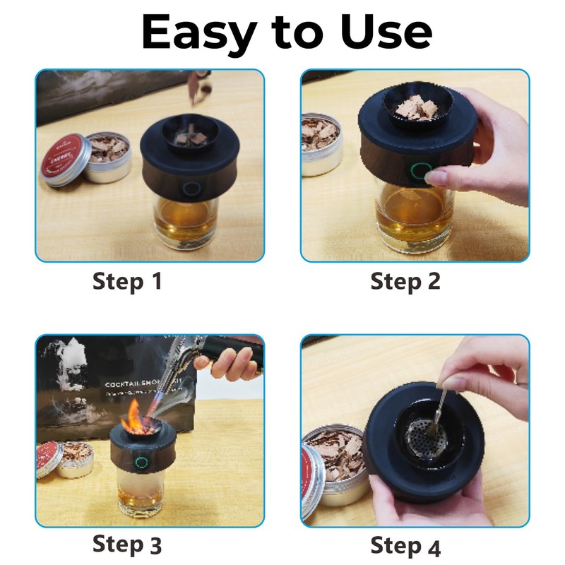 - 🔥 Making Old Fashioned Cocktail — Prepare the smoking gun, mixed wine and cup, use smoking gun to ignite chips which need fully burn, smoke top for cocktails and shake it slightly, stand for a few minutes, flavored drink is made.