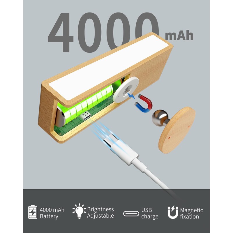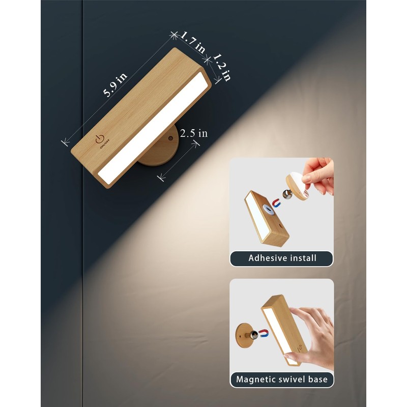 Magnetic Swivel Head,360 Degree Rotatable,adjustable angle light,Peel and Stick Flashlight, 4000mAh Rechargeable Battery Operated,Type-C USB Charging Port,Wireless Portable,Various Mounting Option:Strong Adhesive Base,Screw Install,Self-adhesive metal discs,Magnetised on Metal,On/Off Touch Switch,Stepless dimming,Memory Function,Eye-Caring,Wood Aesthetic,Stylish Modern Design,Well Made,Beautiful Crafted.