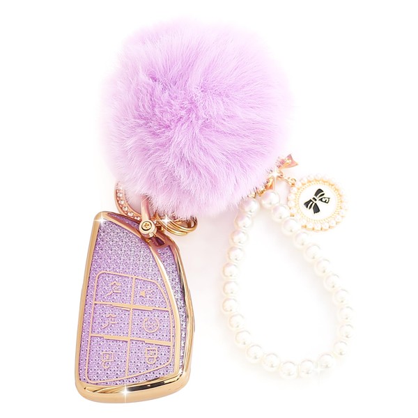 YILINXI Compatible with Chevy 6 Buttons Key Fob Cover with Cute Pom Pom Keychain for Women (Purple)