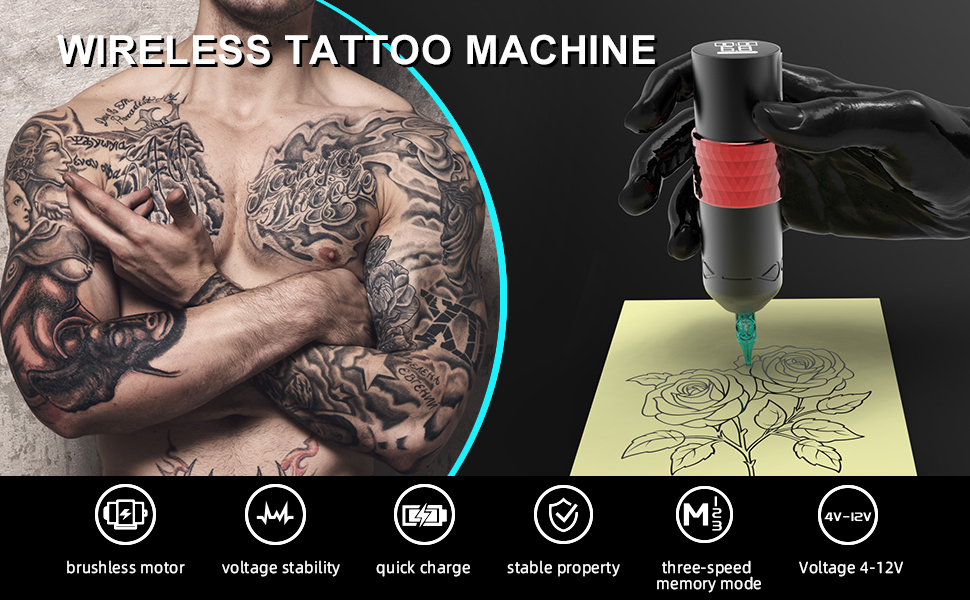 • Rotary battery tattoo pen machine built-in coreless motor, 10V - 10000RPM. More powerful, low skin loss, fast coloring, no hot for long time working. Eccentric wheel system make tattoo machine get stronger and better for liner and shader.