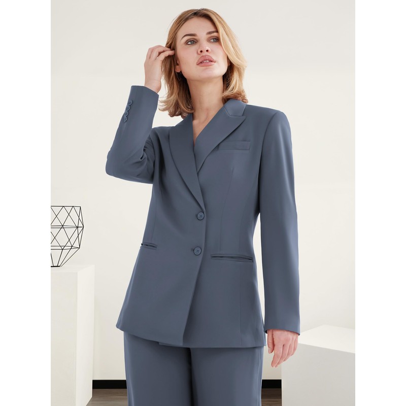 - STYLE: This lovely women's suit features a classic blazer in a soft, solid colour, with two buttons, notched lapels, a single back slit, a handy breast pocket and two flap pockets. The matching pants have a straight front, zipper placket with button closure, elasticated side waist, and two front slash pockets.