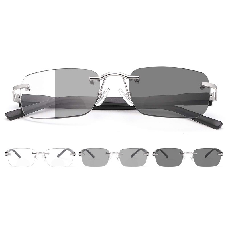 【Multifunctional Rimless Bifocal Reading Glasses】▶ Bifocal lens with blue light blocking and photochromic function,These lenses accommodate for both near and far vision by adding a unique lower lens with add vision value for reading and near vision, while blocks 100% of harmful blue light. Photochromic lenses shift from reading glasses indoor to reading sunglasses outdoor, also you can use it as normal photochromic sunglasses,Radiation protection, UV protection.