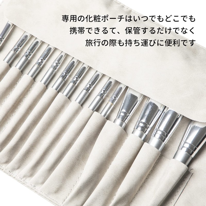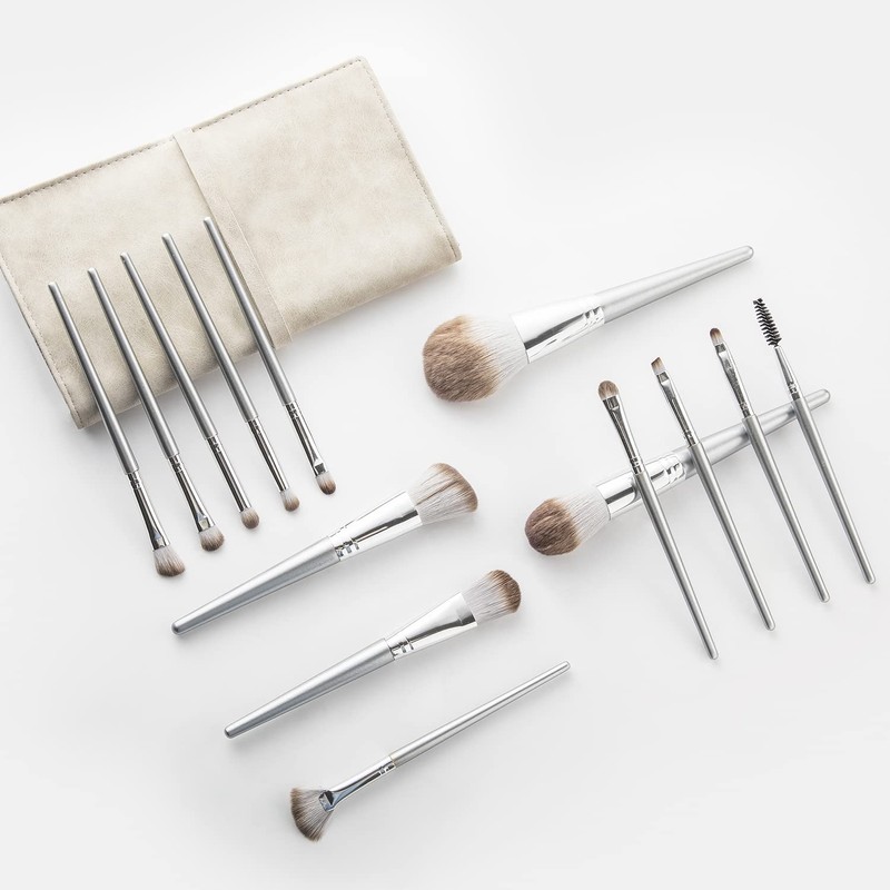 YINAN Studio Makeup Brush Set of 14 Soft Makeup Brushes with Elegance Leather Pouch, Popular Brush Set, Silver Tone