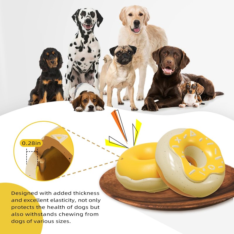 - [Nice Gift ] Cute doughnut shape and nice smell squeaky dog toy is a nice gife for our dog's Birthday and daily play. our bright color beautiful design dog toys are the perfect dog gifts . Get one to surprice your lovely dog friend!