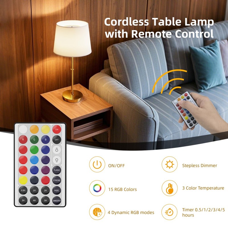 - 【Adjustable Brightness & Multiple Color Modes】The battery powered table lamp offers stepless dimming (20%-100%), 3 color temperatures (cool, warm, and neutral white), 15 RGB color modes, 4 dynamic modes, and a memory function. It's perfect for use as home decor in living room, dining room, bedside, kitchen, counter, and patio, as well as an emergency light source during power outages.