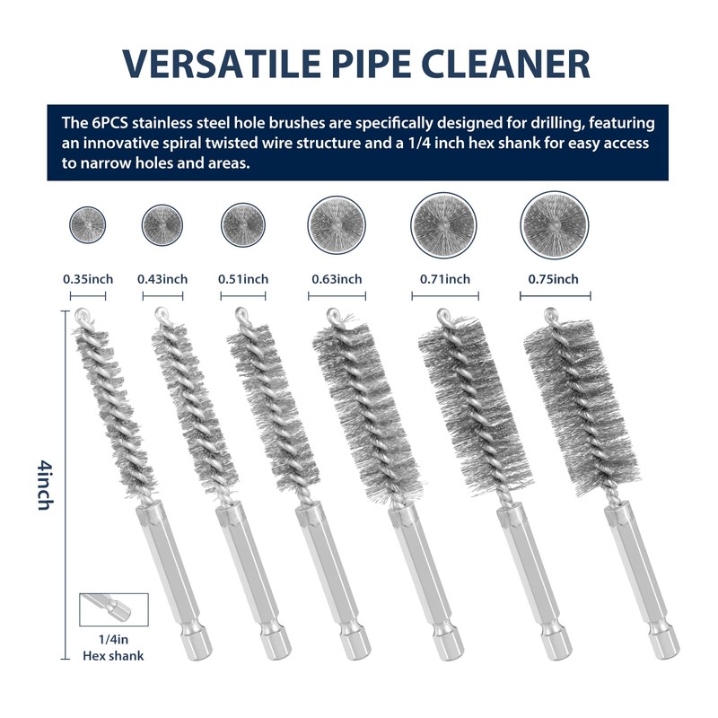 - 6PCS Stainless Steel Spiral Bore Brushes: 1/4-inch Hex Shank for Efficient Narrow Hole Cleaning.