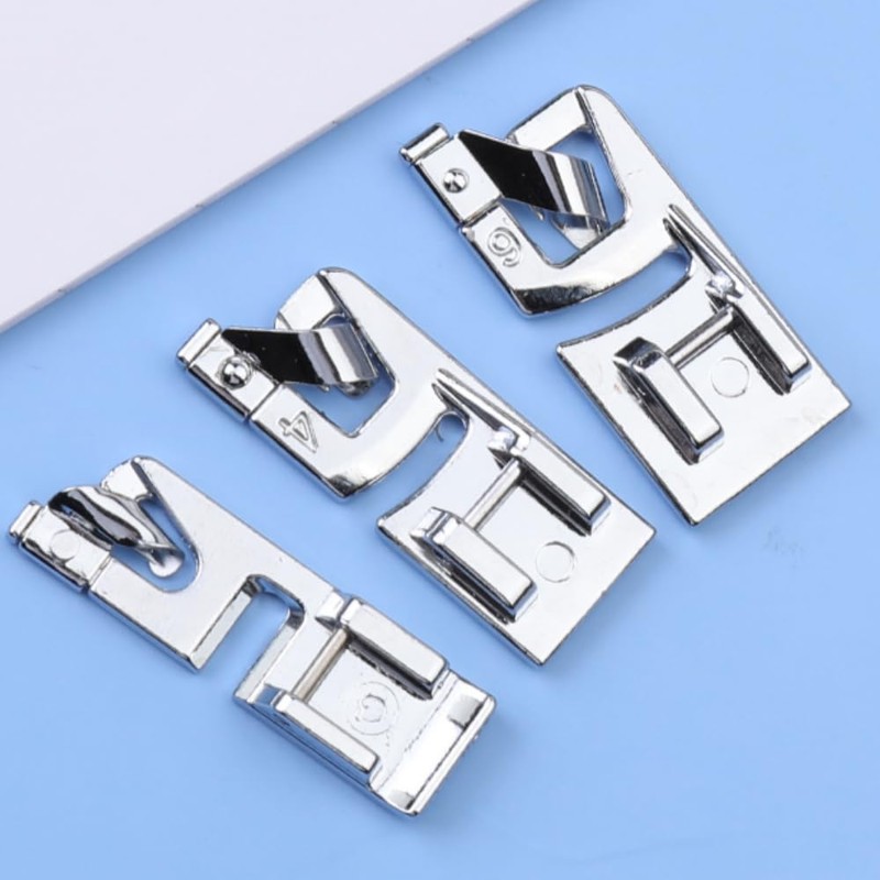 - đ§”ăPACKAGEăThis sewing machines accessories set includes three narrow rolled hem presser feet in 3mm, 4mm, and 6mm sizes, ensuring you can effortlessly create elegant hems on lightweight fabrics. Note: Ensure the presser foot is firmly secured and adjusted before use.