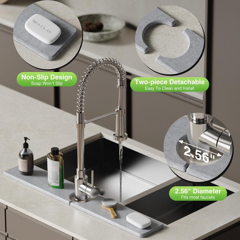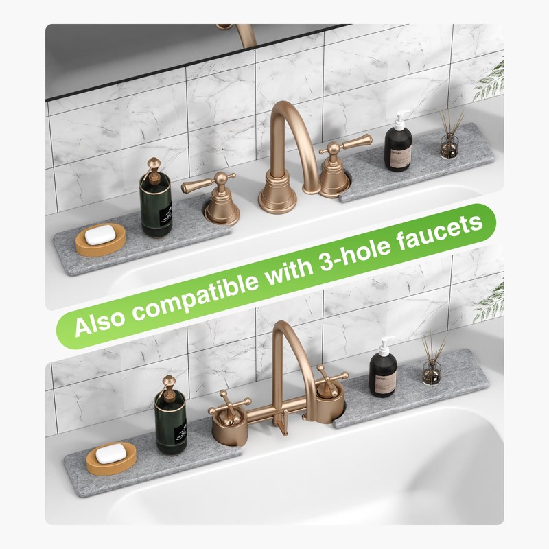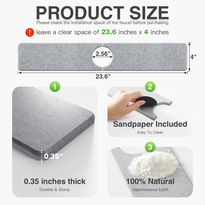 - Product Size: Yinoos Stone Faucet Mat measure 23.6" x 4" with a 2.5" center hole diameter. Make sure there is enough countertop space around the faucet.