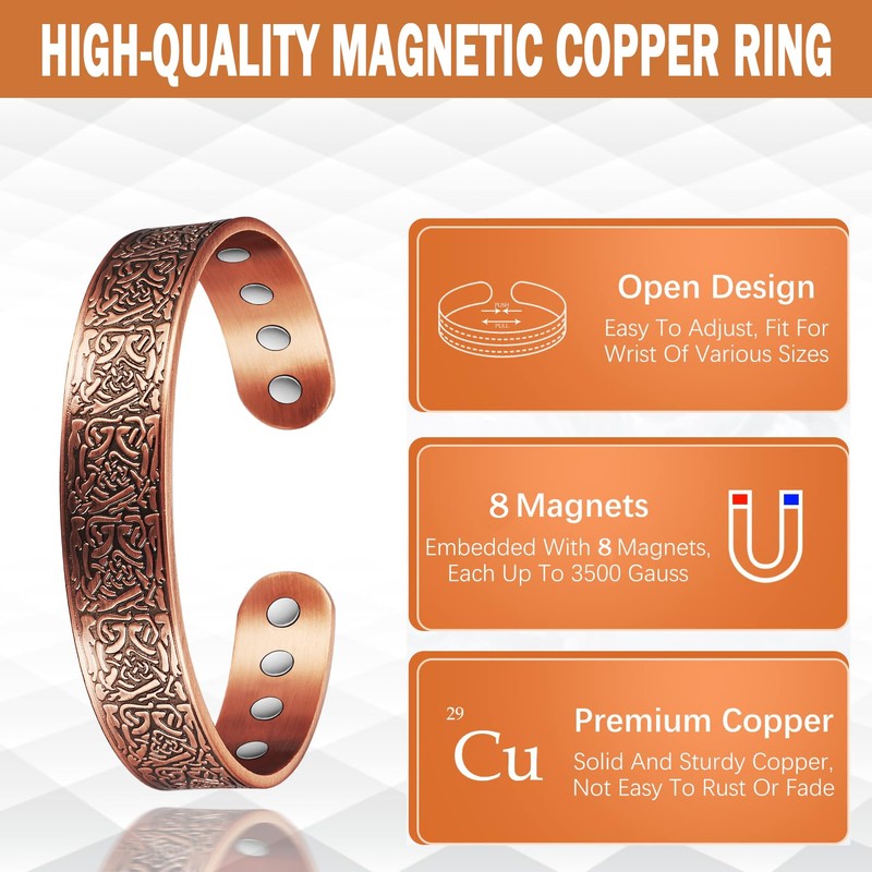 - Pure Copper Bracelet - Made of 100% solid copper, 100% hypoallergenic, lead and nickel free. The interior is made of solid copper and the outside is bright plated. Stronger and more durable, never fade, rust, discolor, turn green, tarnish, corrode, durable paint coating to prevent oxidation, scratch resistant. Enjoy the benefits of pure copper comfortably.