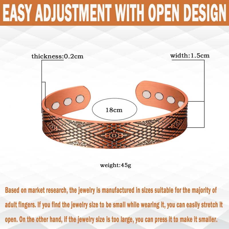 - Pure Copper Bracelet - Made of 100% solid copper, 100% hypoallergenic, lead and nickel free. The interior is made of solid copper and the outside is bright plated. Stronger and more durable, never fade, rust, discolor, turn green, tarnish, corrode, durable paint coating to prevent oxidation, scratch resistant. Enjoy the benefits of pure copper comfortably.
