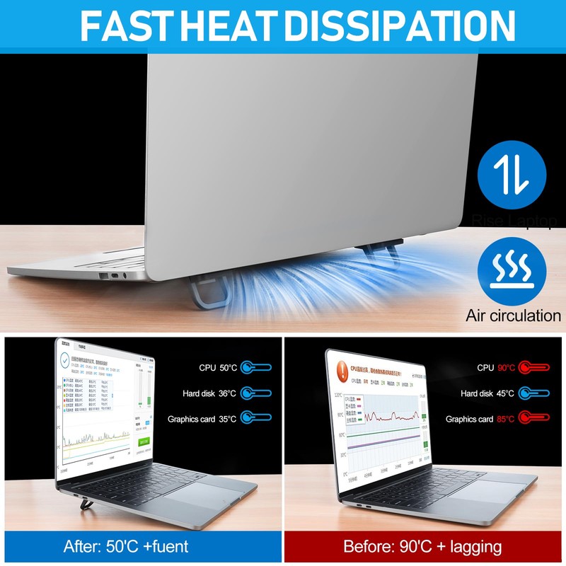 • AST HEAT DISSPATION: This Foldable laptop stand can raise the laptop's height to make the computer run cooler when you type or play games, and prevent it from overheating and crashing when you use laptops for a long time.