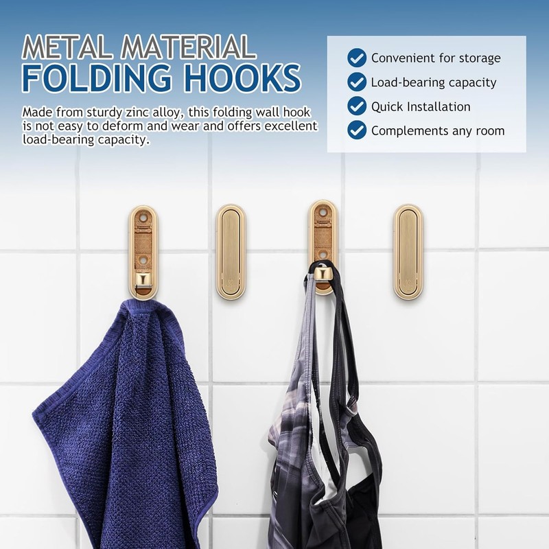- Foldable Wall Hook: With 90° foldable feature, these flip down hooks can be easily hidden when not in use, saving precious space in tight areas. Simply unfold it out when needed for a practical and tidy solution.