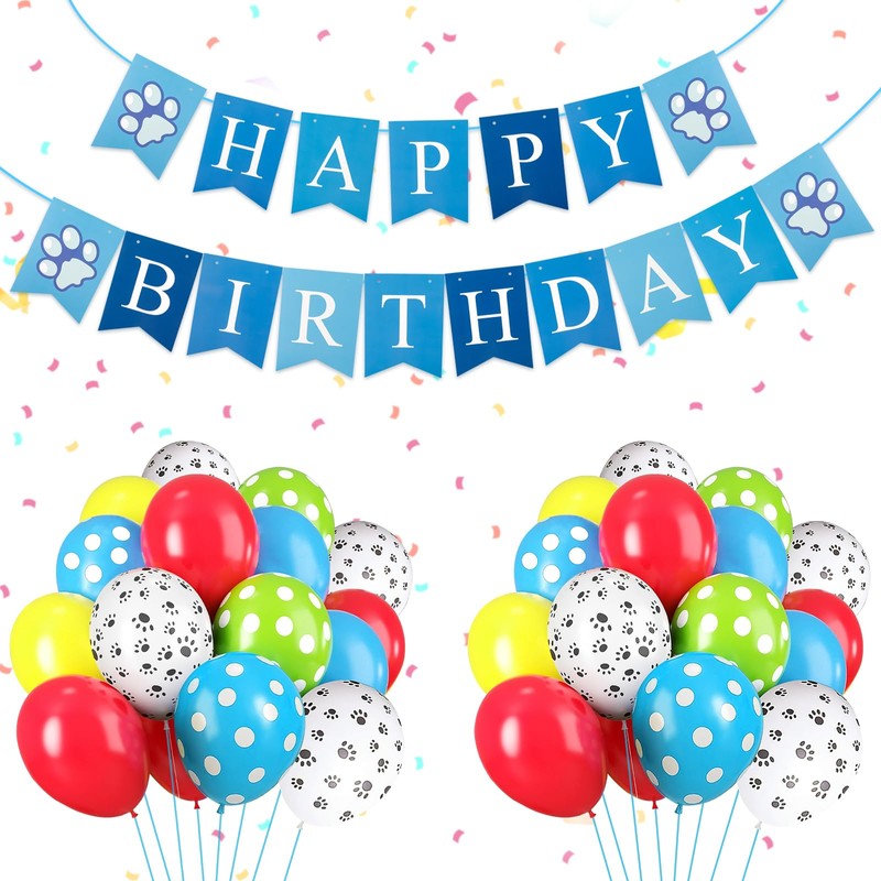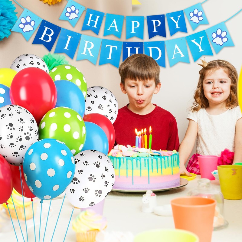- 🎈 Dog Paw Birthday Decorations Boys Girls Pack: Include 1pcs Blue Dog Theme Happy Birthday Banner and 22pcs 12 inch Birthday Latex Balloons (4pcs White Paw Balloons, 4pcs Red Balloons, 4pcs Yellow Balloons, 4pcs Blue Balloons, 4pcs Green Dot Balloons, 2pcs Blue Dot Balloons) and 1pcs random balloon spare, 2pcs 32ft long balloon ribbons.