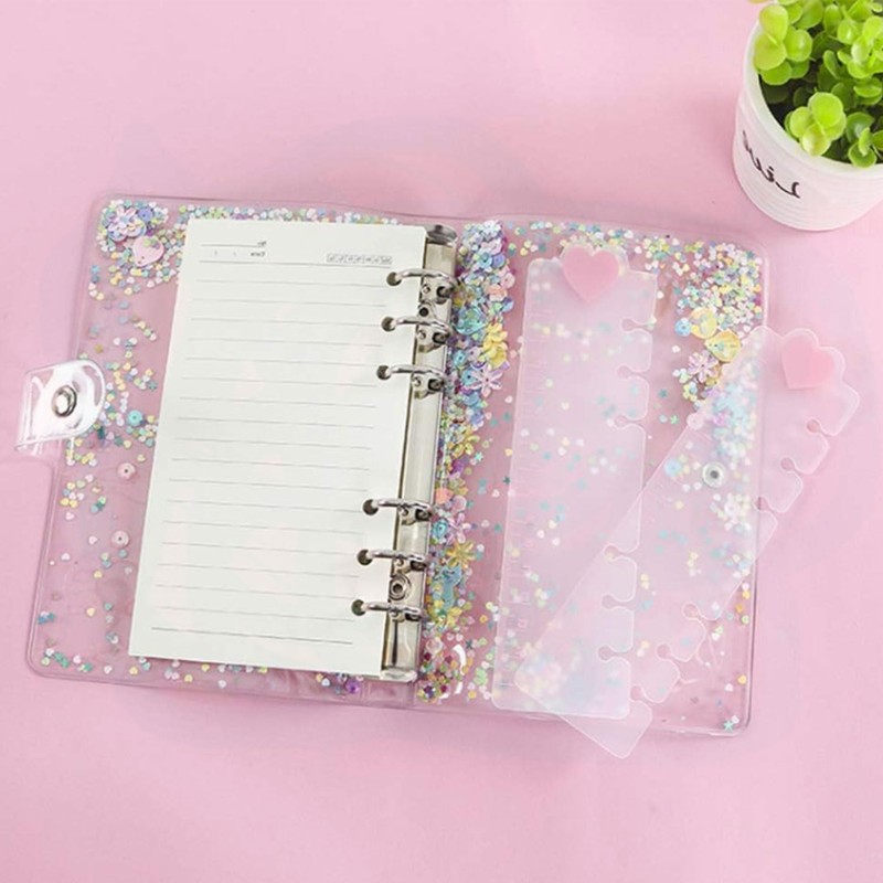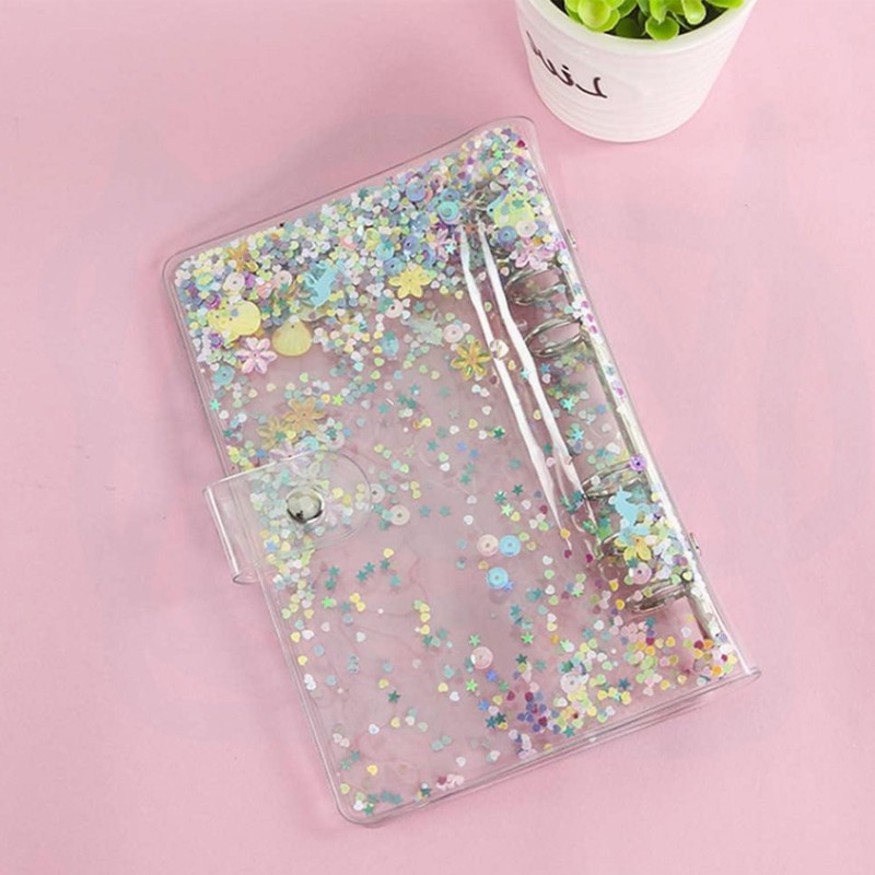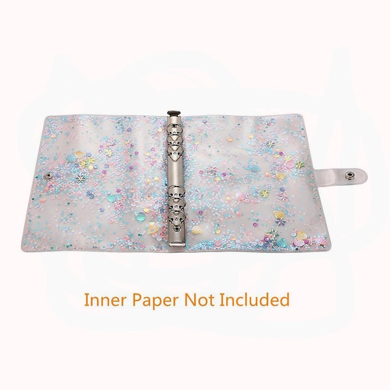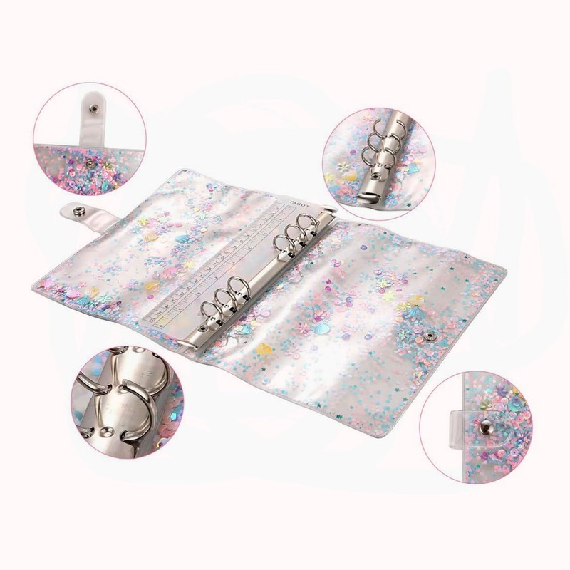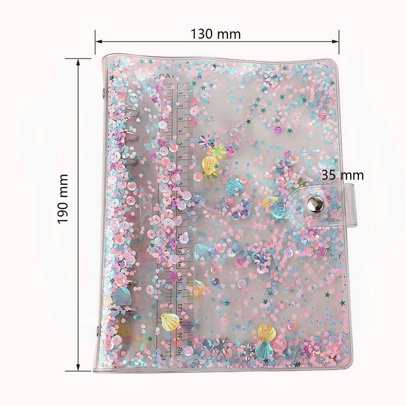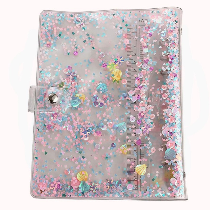 - DESIGN FEATURES: Transparent A6 binder cover with enchanting seashell and floral glitter design, featuring a built-in ruler and secure snap button closure