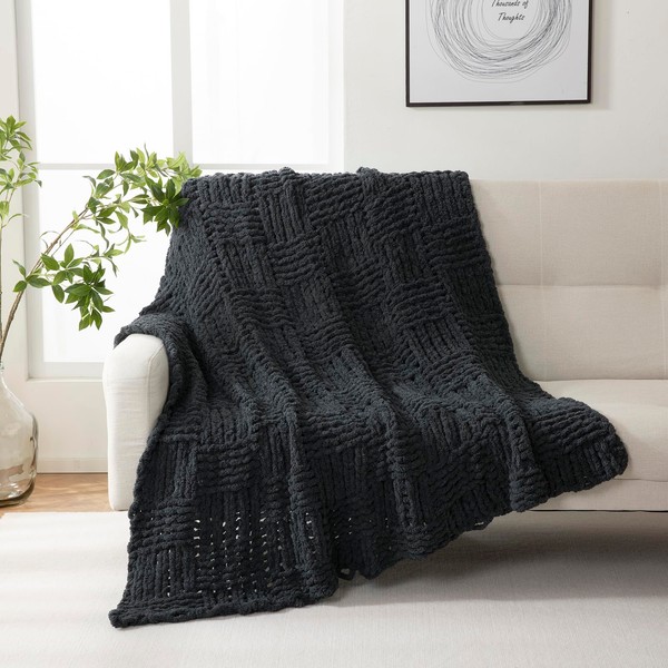 YIRUIO Handmade Chunky Knit Throw Blanket Cable with Checkered Pattern 51''x63'' Oversized Throw Larger Yarn Ultra Soft Cozy Warm for Home Décor Couch Sofa Bed (Black, Throw XL)