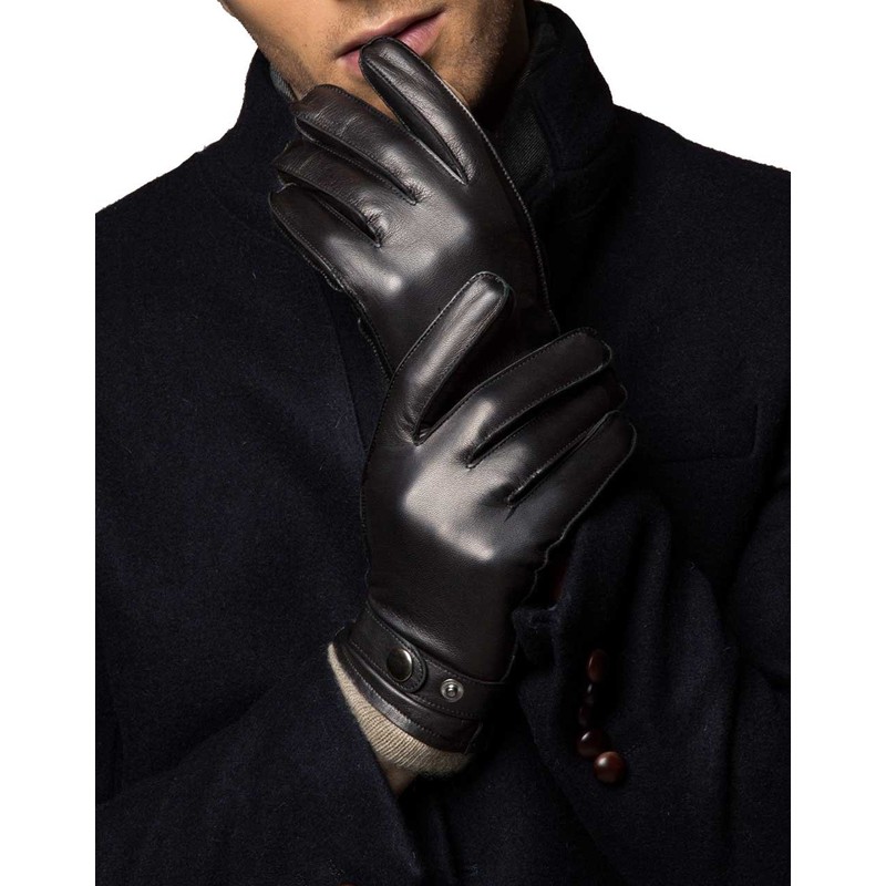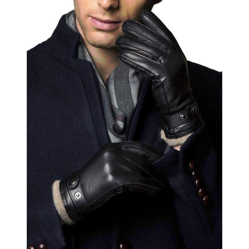 YISEVEN Men's Winter Cashmere Lined Touchscreen Lambskin Leather Gloves, Black - Button Design, 9.0"/M