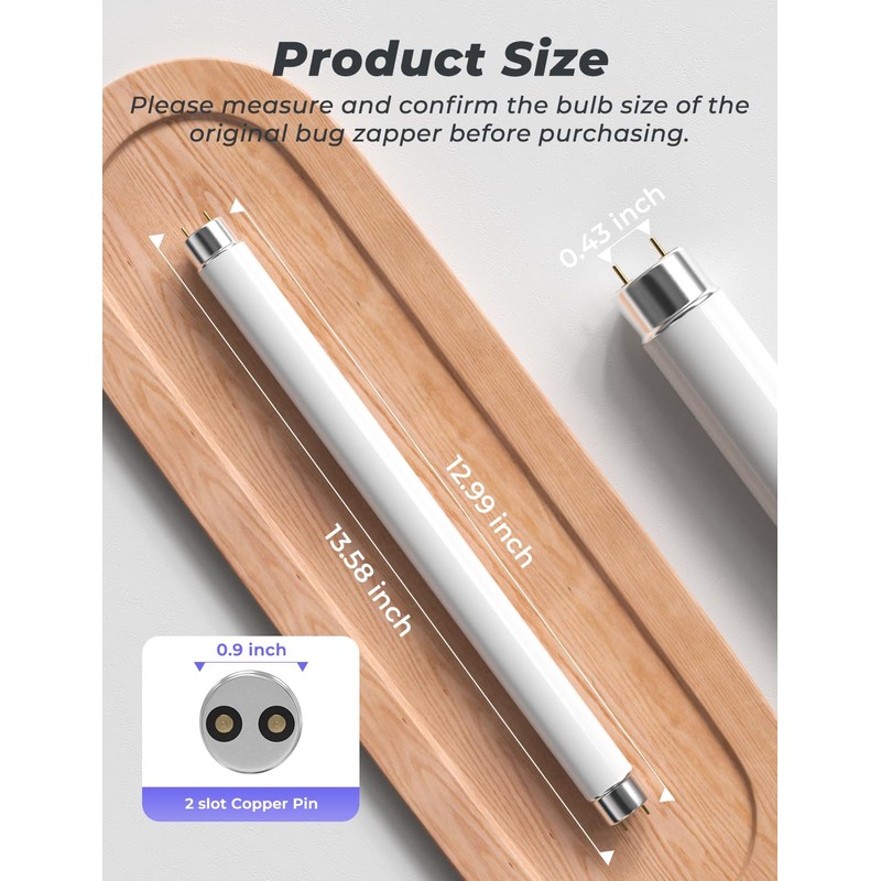 - Perfect Replacement: 10W replacement bulbs compatible with most 20W machines. Comes with a 2-pack of T8 Fluorescent Mosquito Lure Light Tubes, each 10W. The item size is 13.62 x 0.98 inches (L x W). Kind reminder: please check your original bulb's size and pin to make sure fits your machine.