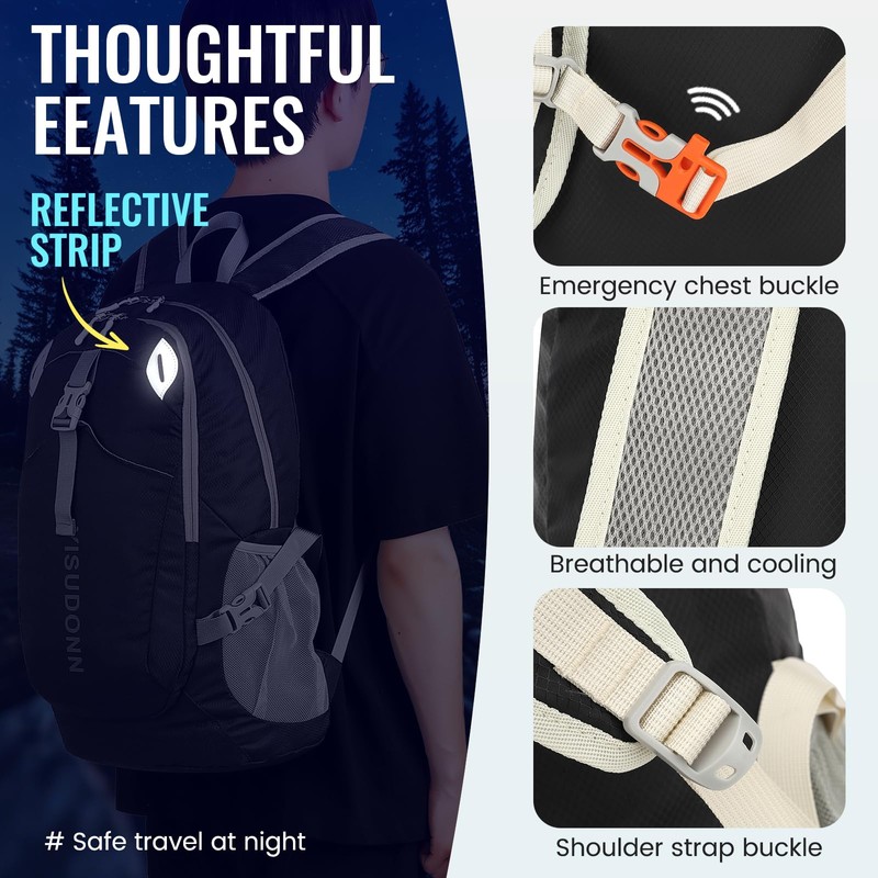 - The Latest Design: We design light packable backpack in line with the principles of ergonomics and focusing on security protection awareness.Travel foldable backpack has the chest protection buckle and whistle.When encounter an emergency,you can sound the whistle waiting for the rescue.There are also protective buckle bands on the side bag to prevent the water bottle and umbrella placed in the side bag fall.The reflector on both sides of the front bag can make you feel more secure at night