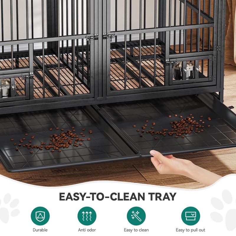 - Easy to Move and Clean: The dog kennel is equipped with 360° rotatable rolling locking wheels for easy movement and fixation. You can easily move the heavy-duty dog cage to different locations as needed. The dog cage is equipped with 2 pull-out trays, and the plastic trays can catch the fallen dog food and feces, making cleaning more convenient