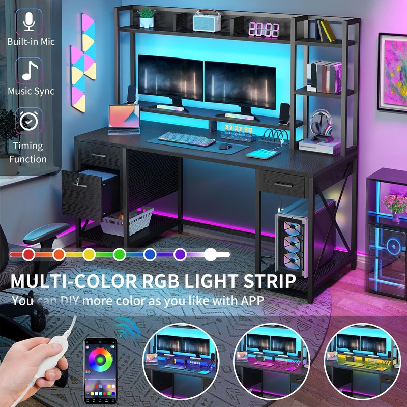YITAHOME Computer Desk with Drawers & Hutch, 59.1" Office Desk with LED Lights & Power Outlets, Gaming Desk with Monitor Stand & Storage Shelves, Black