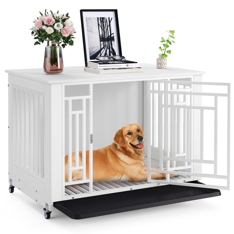 YITAHOME Dog Crate Furniture, Heavy Duty Dog Cage, Wooden Side End Table with Wheels, Chew-Resistant Metal Dog Kennel with Removable Tray, Dog House Indoor for Small Medium Dogs, White