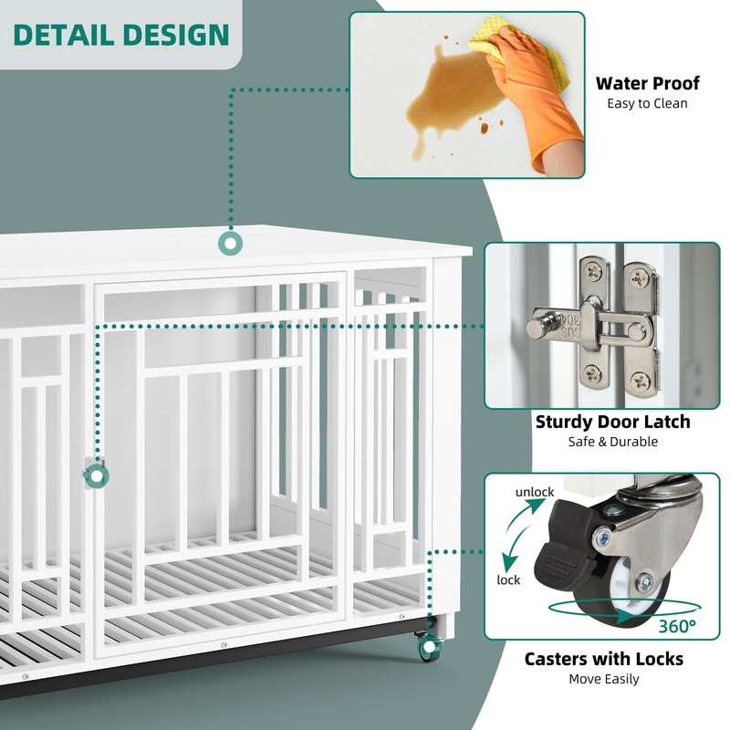 - 360° Lockable Wheels: With built-in wheels, these dog kennel furnitures becomes a breeze to move around your home, allowing flexible placement according to your preferences.The wheels come with locks to secure the dog crate in place.