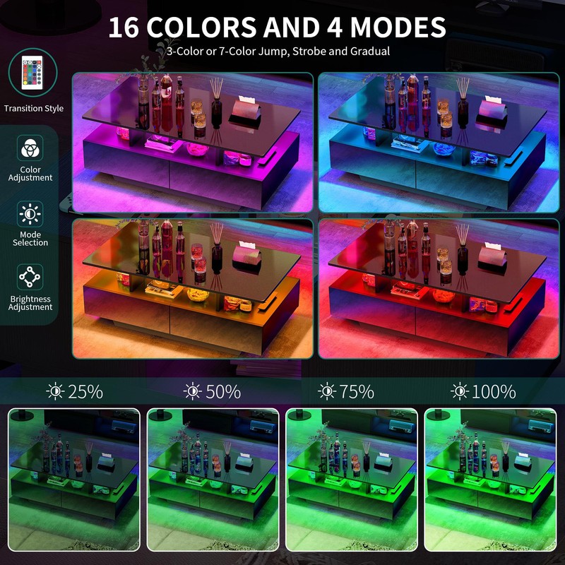 YITAHOME LED Coffee Table with Storage, High Glossy LED Coffee Tables for Living Room, Modern Black Rectangle Coffe Table, Small Center Table with Open Display Shelf & 4 Sliding Drawers, Glossy Black