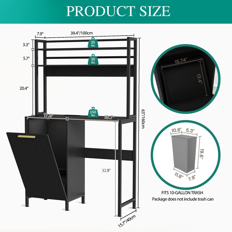 - Trash Can Cabinet Design: The left side of this baker's rack includes a tiltable compartment designed to accommodate a 10-gallon trash can, facilitating easy cleanup in the kitchen or on countertops. Please be aware that the trash can is sold separately