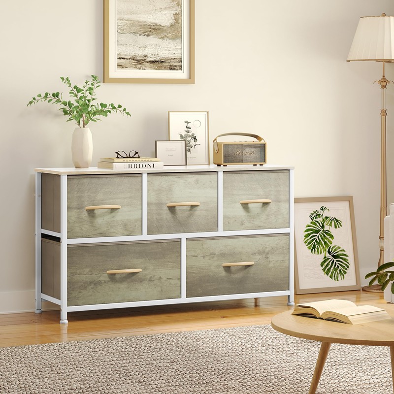 YITAHOME Wide Chest of Drawers, Dresser with 5 Drawers, Oak Greige Fabric Storage Tower, Dresser for Bedroom with 5 Drawers, Living Room, Closets - Sturdy Steel Frame, Wooden Top