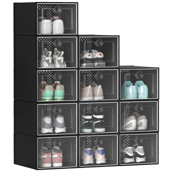 YITAHOME XL Shoe Storage Storage Boxes, 12-Pack Stackable Shoe Rack Organizers with Clear Plastic, Sneaker Containers, Playthings Storage Organizer Bins for Entryway, Closet, Under Bed, Black