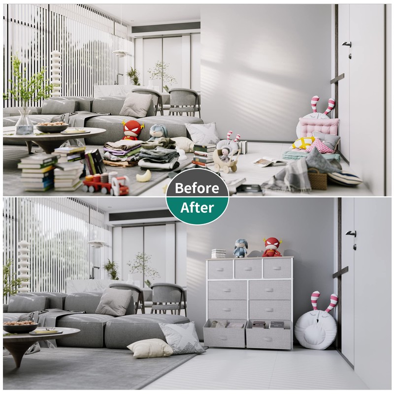 - QUALITY CONSTRUCTION- Structured with a powerful metal frame and a durable MDF wooden top; Contains 9 removable drawers with easy-to-pull fabric handles; Held up by 4 adjustable plastic legs that prevent scratches to your floor; The innovative crossbar design on the back enhances product stability; The dresser can be secured to a wall with screws