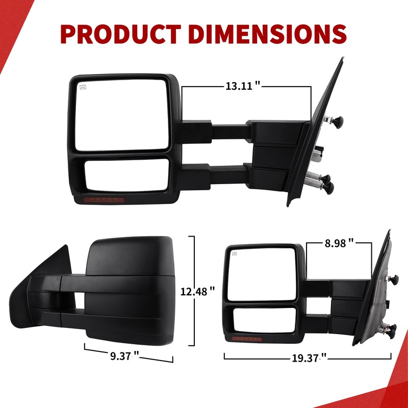 - Package contents & dimensions: a pair of telescoping trailer tow mirrors, including driver side and passenger side; side mirror length is 19.37” (closed) and 23.31” (extended); side mirror size is 12.48”×9.37”