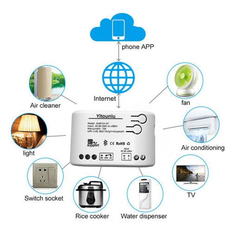 Yitouniu EWeLink 1CH Wireless Smart Switch AC85V-250V Smart WiFi Relay Switch Module, Bluetooth Network, Compatible with Alexa Google Home