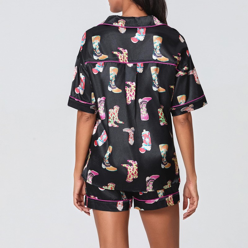 Yiulangde Silk Satin Pjs For Women Y2k Floral Print Pajamas Set 2 Piece Lounge Set Short Sleeve Shirts And Shorts Pajama Sets, Cowboy Boots-black, Large