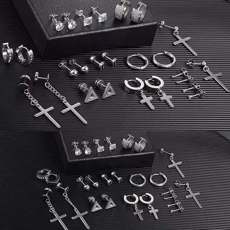 YIUTERA 15 Pares Aretes para Hombre, Aretes Negros para Hombre, Pendientes Unisex de Acero Inoxidable, Estilos de Aretes de Cruz, Aretes Hombre Mujer para Cualquier Peinado y Vestimenta (Plata)